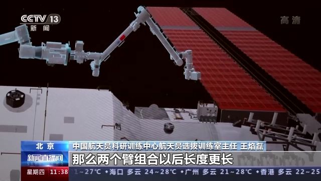 中國航天員科研訓(xùn)練中心航天員選拔訓(xùn)練室主任 王焰磊:我們首次使用兩個(gè)機(jī)械臂,就是大臂小臂形成組合臂的狀態(tài)下支持出艙活動(dòng)任務(wù)。因?yàn)榇蠹铱梢韵胂笠幌?,單臂的長度已經(jīng)很長了,那么兩個(gè)臂組合以后長度更長,它的柔性、剛性等和我們單臂狀態(tài)下是有一些區(qū)別的。在這種情況下載人去支持完成出艙任務(wù),也是我們做首次的一個(gè)驗(yàn)證。