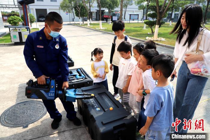 消防員帶領小朋友們參觀炊事車?!〔淘鲂?攝