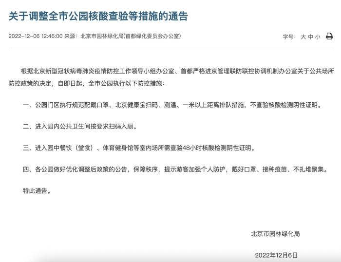 關(guān)于調(diào)整全市公園核酸查驗等措施的通告?!”本┦袌@林綠化局官網(wǎng) 攝