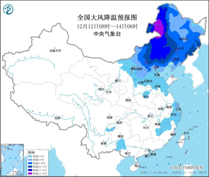 其中,12月12日08時(shí)至14日08時(shí),內(nèi)蒙古中東部、東北地區(qū)大部、華北中北部、山東中部、河南北部、江南中東部等地氣溫將下降4~8℃,其中,內(nèi)蒙古東部、河北北部、遼寧西部、吉林西部等地部分地區(qū)降溫幅度可達(dá)10℃以上;上述部分地區(qū)并有4~6級(jí)偏北風(fēng),陣風(fēng)7~8級(jí)。中央氣象臺(tái)12月12日06時(shí)繼續(xù)發(fā)布大風(fēng)降溫預(yù)報(bào)。