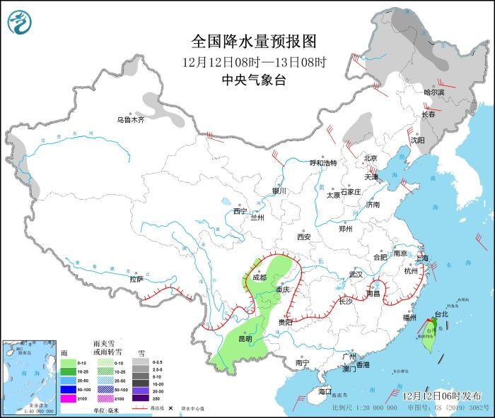 12月12日08時(shí)至13日08時(shí),新疆阿勒泰和南疆盆地西部山區(qū)、內(nèi)蒙古中部和東北部、黑龍江、吉林中東部、遼寧東部等地的部分地區(qū)有小到中雪或雨夾雪。四川東部、云南東部和南部、臺(tái)灣島等地的部分地區(qū)有小雨,局地中雨。華北大部、東北地區(qū)大部、河南東部、山東半島等地的部分地區(qū)有4~6級(jí)風(fēng),其中,內(nèi)蒙古中西部等地部分地區(qū)有6~7級(jí)風(fēng)(見(jiàn)圖3)。