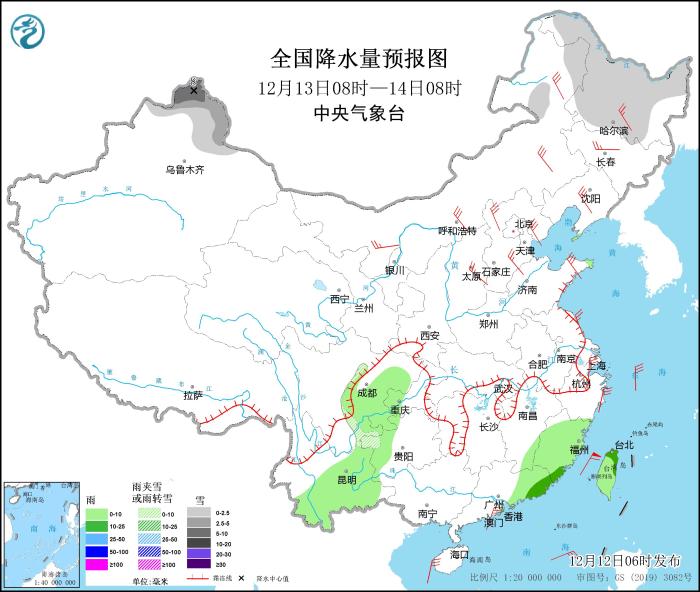 12月13日08時(shí)至14日08時(shí),內(nèi)蒙古東北部、黑龍江大部、新疆北部、山東半島東北部等地部分地區(qū)有小到中雪,其中,新疆阿勒泰等地局地有大雪(5~8毫米)。四川盆地大部、云南東部和南部、貴州西部、廣東東部、福建、臺(tái)灣島等地部分地區(qū)有小雨,局地有中雨。華北大部、東北地區(qū)大部、山東半島、浙江北部等地部分地區(qū)有4~6級(jí)風(fēng)(見(jiàn)圖4)。