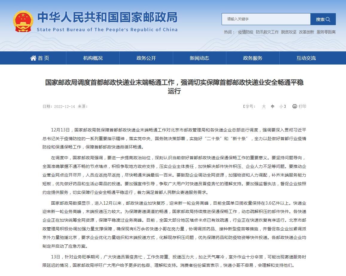 國家郵政局?jǐn)?shù)據(jù)顯示,進(jìn)入12月以來,郵政快遞業(yè)加快復(fù)蘇,迎來新一輪業(yè)務(wù)高峰,目前全國單日攬收量保持在3.6億件以上。快遞業(yè)迎來新一輪業(yè)務(wù)高峰,末端投遞壓力較大。為保障寄遞渠道的暢通,國家郵政局持續(xù)推進(jìn)保通保暢工作,動(dòng)態(tài)疏解積壓的郵件快件。各快遞企業(yè)正在加快統(tǒng)籌全網(wǎng)資源,保障平穩(wěn)渡過業(yè)務(wù)高峰。目前,全國大部分地區(qū)堵點(diǎn)卡點(diǎn)已有效疏通,行業(yè)正在快速恢復(fù)有序運(yùn)行。北京市郵政管理局積極協(xié)調(diào)加強(qiáng)力量支撐保障,確保現(xiàn)有6萬余名快遞小哥在崗力量,協(xié)調(diào)調(diào)派藥品、接種新型疫苗等措施,并督促各企業(yè)加緊調(diào)派京外力量馳援北京,要求企業(yè)優(yōu)化力量組織和末端投遞方式,化解現(xiàn)存積壓問題,優(yōu)先保障藥品和防疫物資等快件投遞。各郵政快遞企業(yè)均制定并啟動(dòng)了應(yīng)急方案。