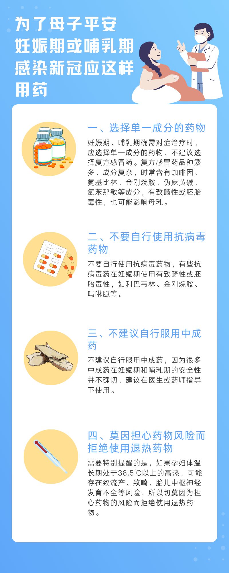 妊娠期、哺乳期的新冠病毒感染者用藥若不科學,可能直接危害寶寶健康,但媽媽們?nèi)羰恰坝部浮敝挥盟?,高燒等癥狀也會影響胎兒發(fā)育和哺乳。對此,陸軍軍醫(yī)大學陸軍特色醫(yī)學中心藥劑科專家為“準媽媽”和哺乳期媽媽整理出了新冠用藥指南。