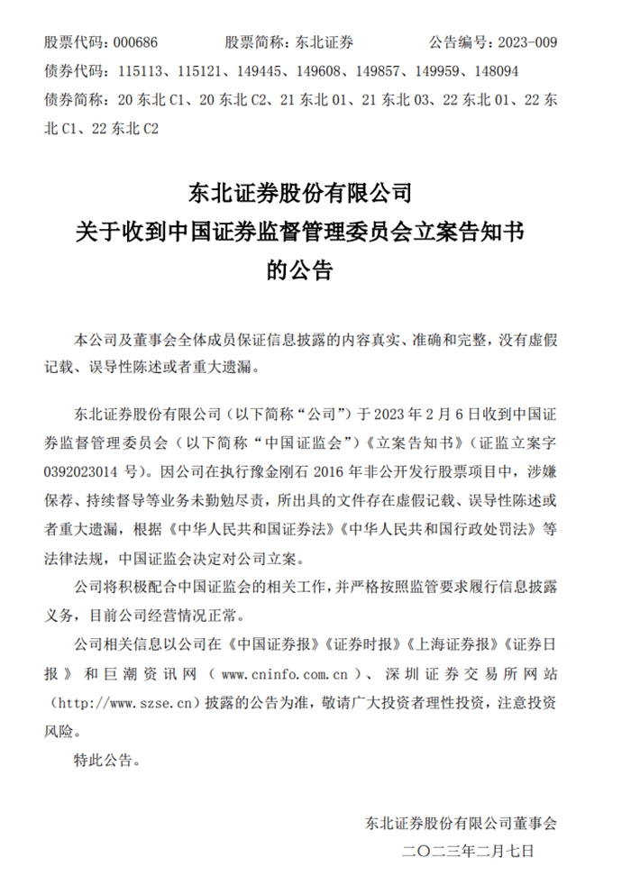 中新網(wǎng)2月7日電 7日,東北證券發(fā)公告稱,東北證券股份有限公司于2023年2月6日收到中國證券監(jiān)督管理委員會《立案告知書》(證監(jiān)立案字 0392023014 號)。因公司在執(zhí)行豫金剛石2016年非公開發(fā)行股票項目中,涉嫌保薦、持續(xù)督導等業(yè)務未勤勉盡責,所出具的文件存在虛假記載、誤導性陳述或者重大遺漏,根據(jù)相關法律法規(guī),中國證監(jiān)會決定對公司立案。(中新財經)
