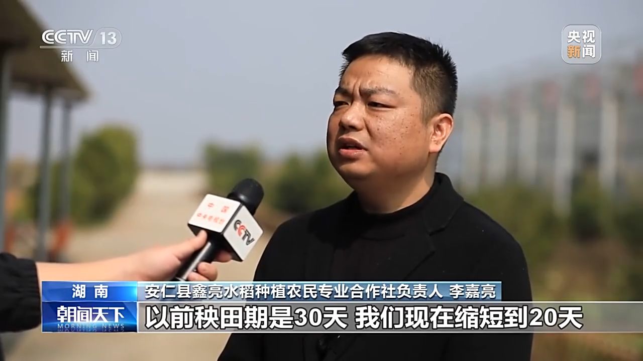 湖南省安仁縣鑫亮水稻種植農(nóng)民專業(yè)合作社負(fù)責(zé)人 李嘉亮:以前秧田期是30天,我們現(xiàn)在縮短到20天,可以為周邊的農(nóng)戶提供2.5萬畝到3萬畝的秧苗。