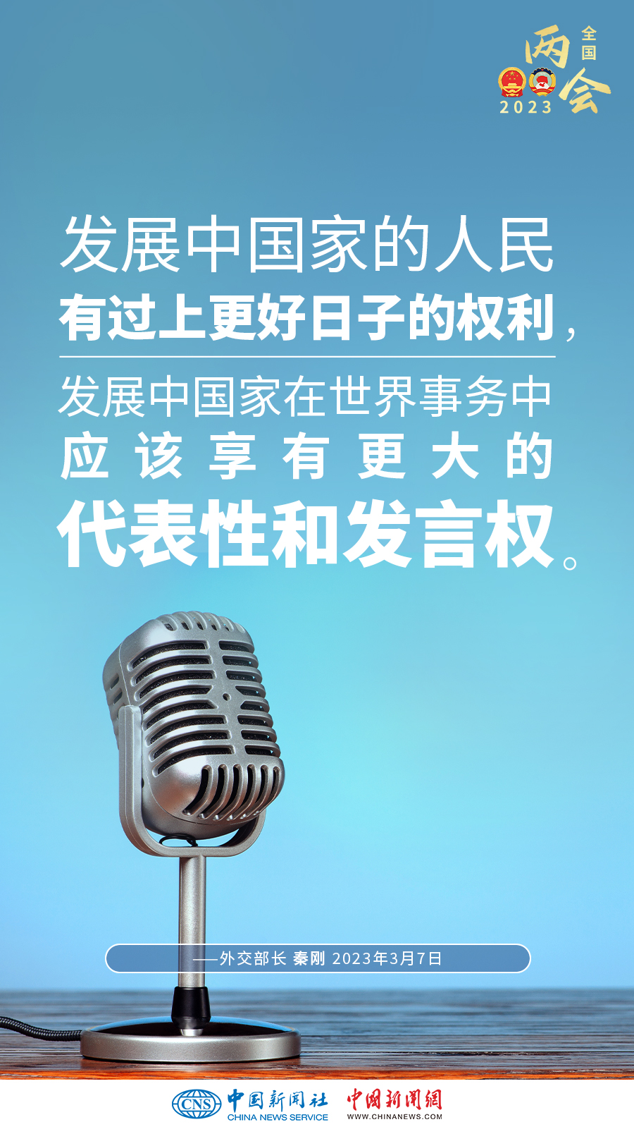 秦剛:發(fā)展中國家占世界人口總數(shù)的80%以上,對世界經(jīng)濟增長的貢獻率超過70%。發(fā)展中國家的人民有過上更好日子的權(quán)利,發(fā)展中國家在世界事務中應該享有更大的代表性和發(fā)言權(quán)。