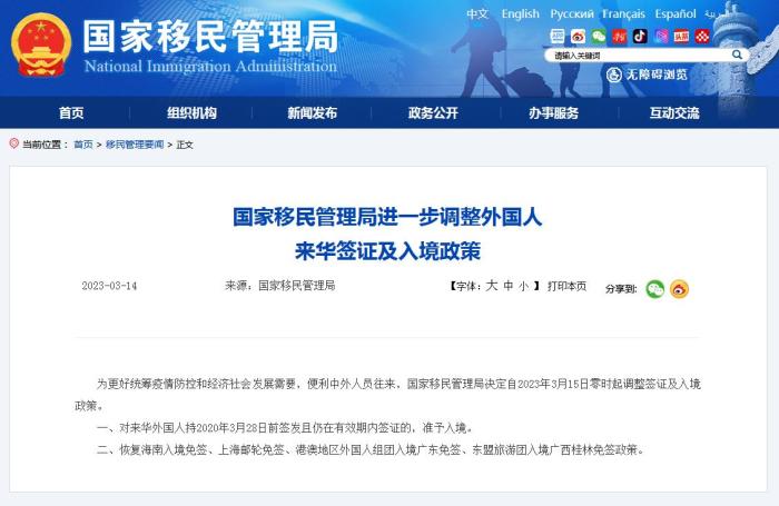 中新網(wǎng)3月14日電 據(jù)國家移民管理局網(wǎng)站消息,為更好統(tǒng)籌疫情防控和經(jīng)濟(jì)社會(huì)發(fā)展需要,便利中外人員往來,國家移民管理局決定自2023年3月15日零時(shí)起調(diào)整簽證及入境政策。