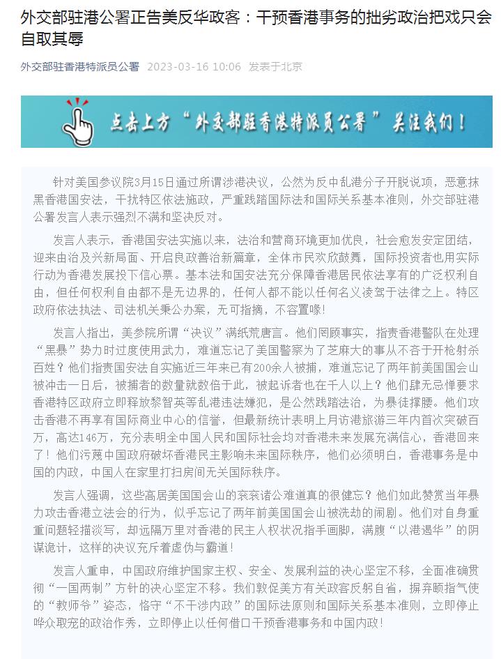 外交部駐港公署正告美反華政客:干預香港事務的拙劣政治把戲只會自取其辱