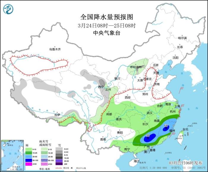 3月24日08時(shí)至25日08時(shí),西藏西部、青海東部、甘肅南部、山西北部、川西高原北部等地的部分地區(qū)有小到中雪或雨夾雪。江南南部、華南中北部等地的部分地區(qū)有中到大雨,其中,江西南部、福建中部、廣東北部等地部分地區(qū)有暴雨(50~90毫米)。黃海大部海域?qū)⒂?~7級風(fēng)、陣風(fēng)8級,部分海域陣風(fēng)可達(dá)9級。