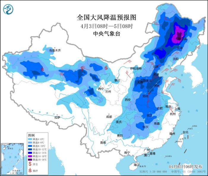 受較強冷空氣影響,4月3日08時至5日08時,新疆南疆盆地、西北地區(qū)中部、內蒙古西部和東北部、華北、東北地區(qū)、黃淮、江漢、江淮中西部、江南中西部等地氣溫將下降4~8℃,其中,內蒙東北部、東北地區(qū)西部、華北南部等地局地降溫幅度可達10℃以上;上述部分地區(qū)并有5~6級偏北風,陣風7~9級。新疆南部和東部、內蒙古西部、甘肅西部等地有沙塵天氣(見圖1)。3日夜間,渤海、黃海西南部海域、東海西北部海域、長江口附近海域將有8級、陣風9級的大風,其中渤海灣將有9級、陣風10級的大風。中央氣象臺4月3日06時繼續(xù)發(fā)布大風降溫預報和海上大風黃色預警。