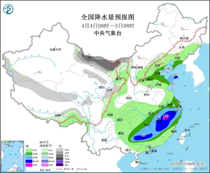 4月4日08時至5日08時,內蒙古西部、新疆南疆盆地和東部、西藏北部和東部、西北地區(qū)中東部、川西高原北部等地部分地區(qū)有小雪或雨夾雪,其中,內蒙古西北部、新疆東部等地部分地區(qū)有中到大雪(5~8毫米)。遼東半島、華北東部、山東半島、江南大部、華南北部等地部分地區(qū)有中到大雨,其中,山東東部、安徽南部、湖南南部、江西中東部、浙江西部、福建西北部、廣西東北部、廣東西北部等地部分地區(qū)有暴雨或大暴雨(100~110毫米)。內蒙古中東部、東北地區(qū)、新疆南疆盆地、華北、江淮東部、江南東部等地部分地區(qū)有4~6級風(見圖4)。渤海、渤海海峽將有7~9級、陣風10級的偏北風,黃海中部和南部將有7~8級、陣風9級的東南風,東海北部將有7~8級、陣風9級的東南風轉6~7級、陣風8級的偏南風。