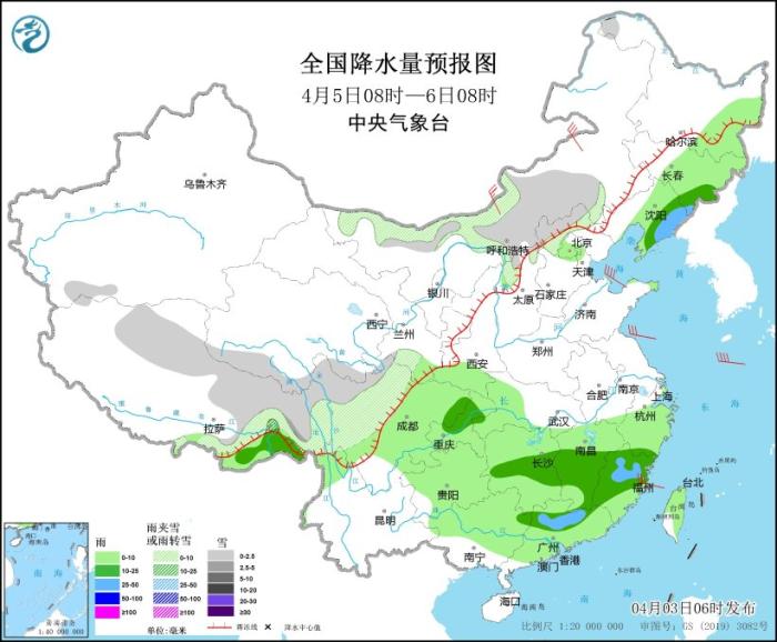 圖4 全國降水量預報圖(4月4日08時-5日08時)