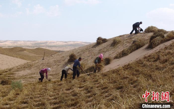 白芨灘林場(chǎng)員工扎麥草方格進(jìn)行治沙(資料圖)。 寧夏靈武白芨灘國(guó)家級(jí)自然保護(hù)區(qū)管理局供圖