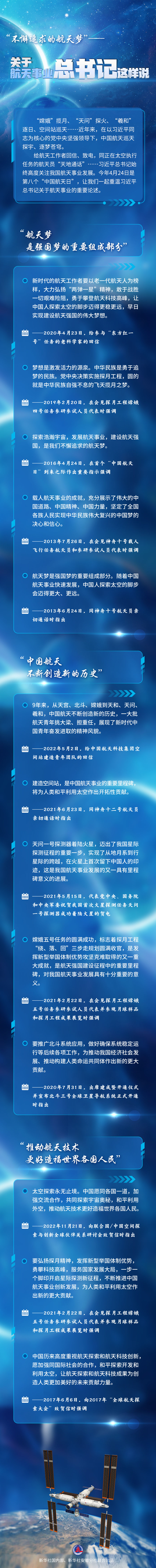給航天工作者回信、致電,同正在太空?qǐng)?zhí)行任務(wù)的航天員“天地通話”……習(xí)近平總書(shū)記始終高度關(guān)注我國(guó)航天事業(yè)發(fā)展。今年4月24日是第八個(gè)“中國(guó)航天日”,讓我們一起重溫習(xí)近平總書(shū)記關(guān)于航天事業(yè)的重要論述。