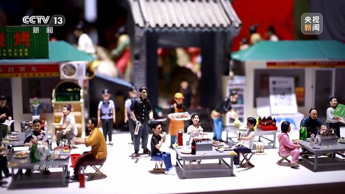 要說本次文博會最吸引人的展位,淄博燒烤算一個??墒牵瑹驹趺催M(jìn)了文博會?原來,這是一個2.8米長的軟陶泥塑微縮景觀,生動還原了淄博燒烤的現(xiàn)實場景。此外,展臺上的琉璃燒烤大餐也吸引了不少人拍照打卡。當(dāng)然,現(xiàn)場還是有可以吃的美食——大名鼎鼎的山東煎餅。