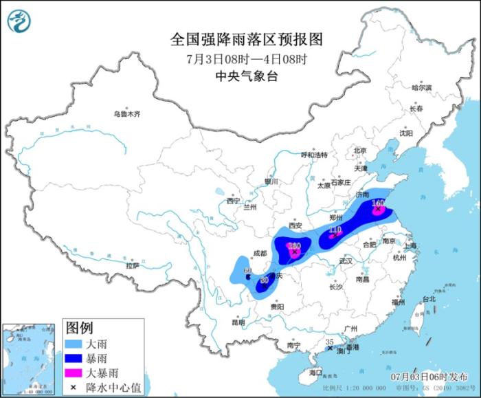 7月3日,四川盆地至黃淮一帶有大到暴雨,局地有大暴雨,并伴有短時(shí)強(qiáng)降水、雷暴大風(fēng)等強(qiáng)對(duì)流天氣;4日至5日,遼寧、吉林、黑龍江西部和南部、內(nèi)蒙古東北部等地將先后出現(xiàn)大到暴雨、局地大暴雨。
