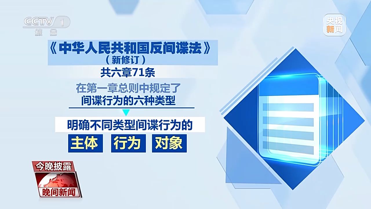 國家安全是安邦定國的重要基石。近年來,我國面臨的安全威脅日趨多元,反間諜斗爭形勢也更加嚴峻復雜。從本月起,新修訂的《反間諜法》開始施行。新法對間諜行為,做出進一步充實和細化。那么按照新法,哪些行為將被認定為間諜行為?作為普通群眾,一旦發(fā)現(xiàn)間諜行為,又該如何處理呢?今晚披露,一塊來關注。