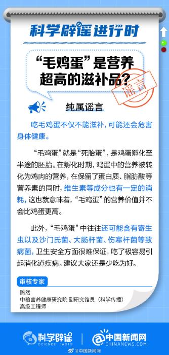 純屬謠言!“毛雞蛋”就是“死胎蛋”,是雞蛋孵化至半途的胚胎。“毛雞蛋”的營養(yǎng)價值并不比雞蛋更高,其中還可能含有寄生蟲以及沙門氏菌、大腸桿菌、傷寒桿菌等致病菌,衛(wèi)生安全很難保證,吃了極容易引起消化道疾病。(來源:科學(xué)辟謠、中國新聞網(wǎng)微博)
