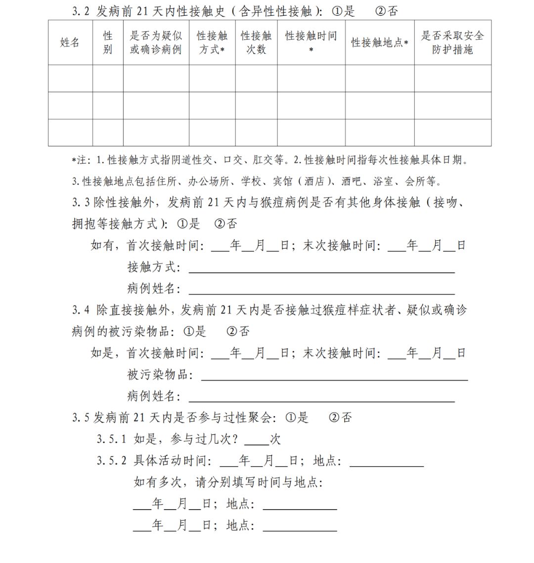 開展個(gè)案調(diào)查時(shí),要認(rèn)真、詳細(xì)了解和記錄病例基本信息、發(fā)病就診情況、臨床表現(xiàn)、轉(zhuǎn)歸及實(shí)驗(yàn)室檢測(cè)信息;發(fā)病前21天內(nèi)與可疑感染來(lái)源的接觸史、接觸場(chǎng)所及接觸方式;發(fā)病后至隔離治療前的具體活動(dòng)地點(diǎn)、與其有皮膚或黏膜直接接觸者,以及發(fā)病前4天內(nèi)與其有性接觸者。