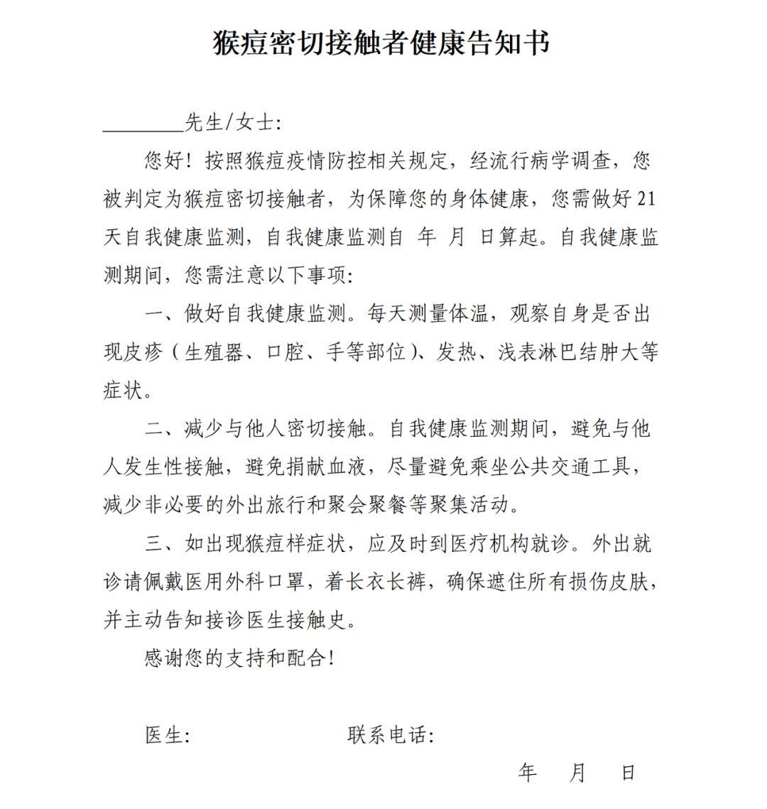 密切接觸者自我健康監(jiān)測(cè)期間可正常生活與工作,需避免與他人發(fā)生性接觸等密切接觸,避免捐獻(xiàn)血液等;堅(jiān)持每天做好體溫測(cè)量和癥狀監(jiān)測(cè),出現(xiàn)猴痘樣癥狀應(yīng)及時(shí)就診并主動(dòng)報(bào)告可疑接觸史。轄區(qū)疾控機(jī)構(gòu)或基層醫(yī)療衛(wèi)生機(jī)構(gòu)應(yīng)在密切接觸者自我健康監(jiān)測(cè)第7、14、21天上門或電話對(duì)其進(jìn)行隨訪,提供咨詢指導(dǎo),發(fā)現(xiàn)異常情況及時(shí)進(jìn)行處置。