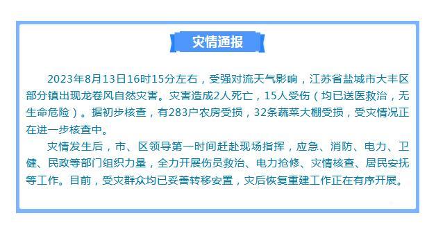 中新網8月13日電 據(jù)江蘇鹽城大豐區(qū)委區(qū)政府官方微信消息,8月13日16時15分左右,受強對流天氣影響,江蘇省鹽城市大豐區(qū)部分鎮(zhèn)出現(xiàn)龍卷風自然災害。災害造成2人死亡,15人受傷(均已送醫(yī)救治,無生命危險)。據(jù)初步核查,有283戶農房受損,32條蔬菜大棚受損,受災情況正在進一步核查中。