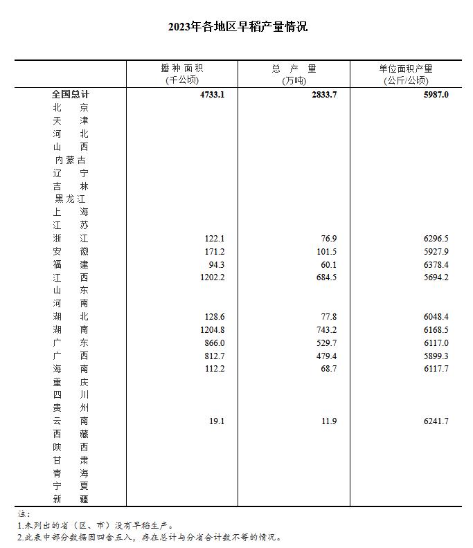 中新網(wǎng)8月23日電 國(guó)家統(tǒng)計(jì)局網(wǎng)站23日發(fā)布關(guān)于2023年早稻產(chǎn)量數(shù)據(jù)的公告。根據(jù)早稻抽樣調(diào)查結(jié)果推算,2023年全國(guó)早稻播種面積、單位面積產(chǎn)量、總產(chǎn)量如下: