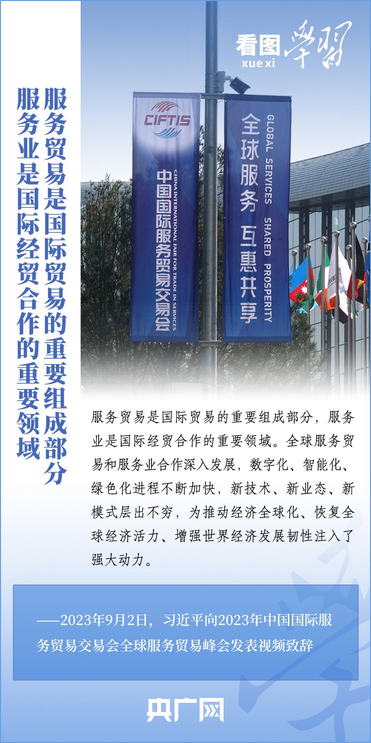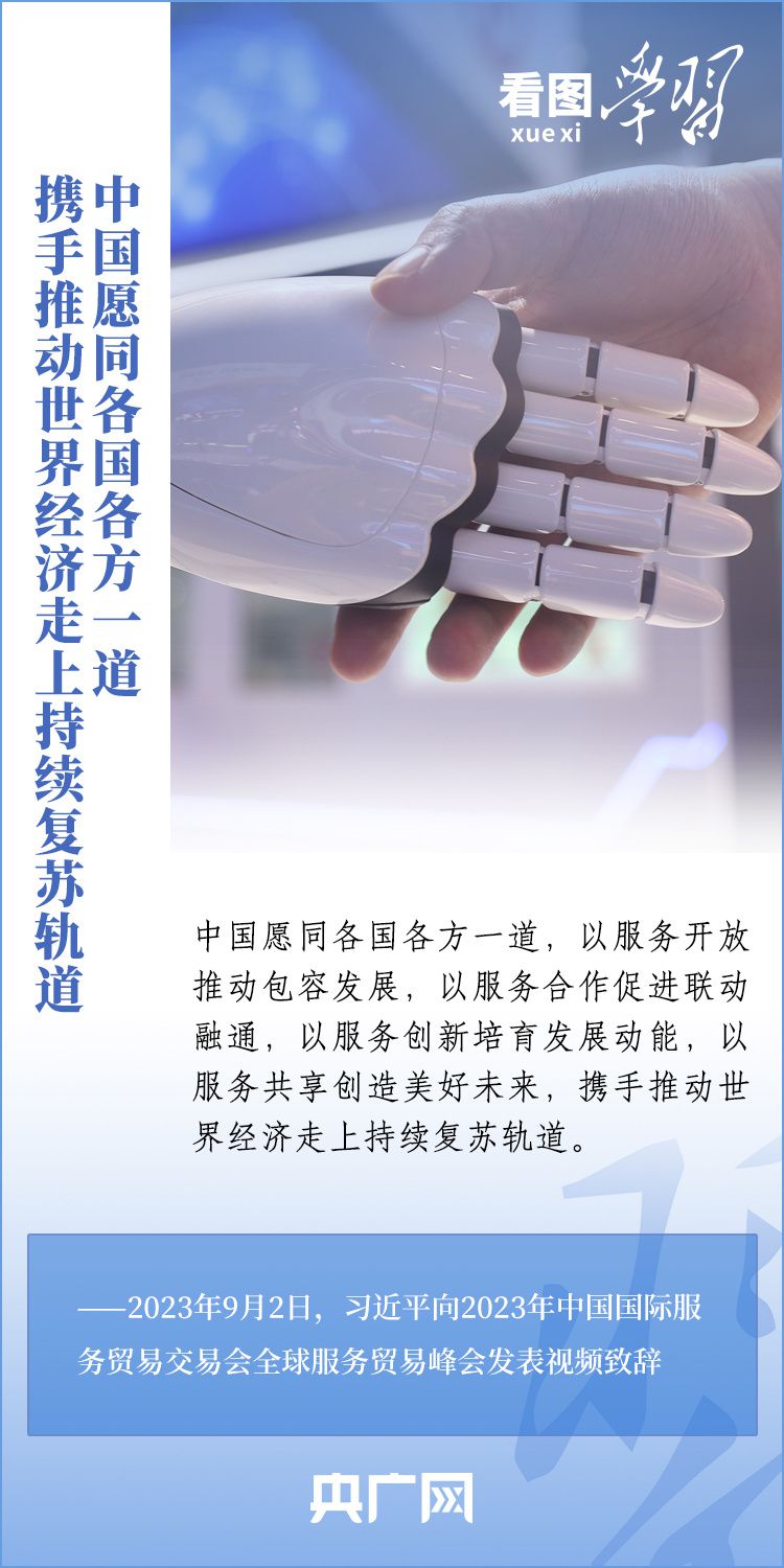 9月2日上午,以“開放引領發(fā)展 合作共贏未來”為主題的2023年中國國際服務貿(mào)易交易會在北京舉行。國家主席習近平向2023年中國國際服務貿(mào)易交易會全球服務貿(mào)易峰會發(fā)表視頻致辭表示,中國愿同各國各方一道,攜手推動世界經(jīng)濟走上持續(xù)復蘇軌道。一起來學習!