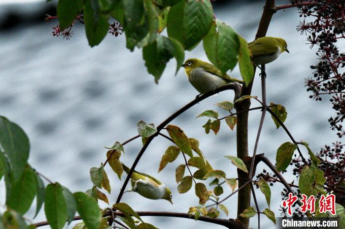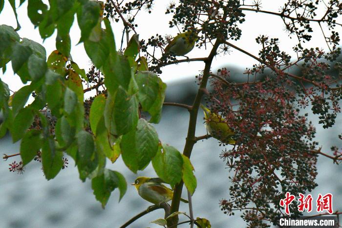 圖為在云南大山包黑頸鶴國家級(jí)自然保護(hù)區(qū)拍攝到的紅脅繡眼鳥和灰腹繡眼鳥?!翘?攝