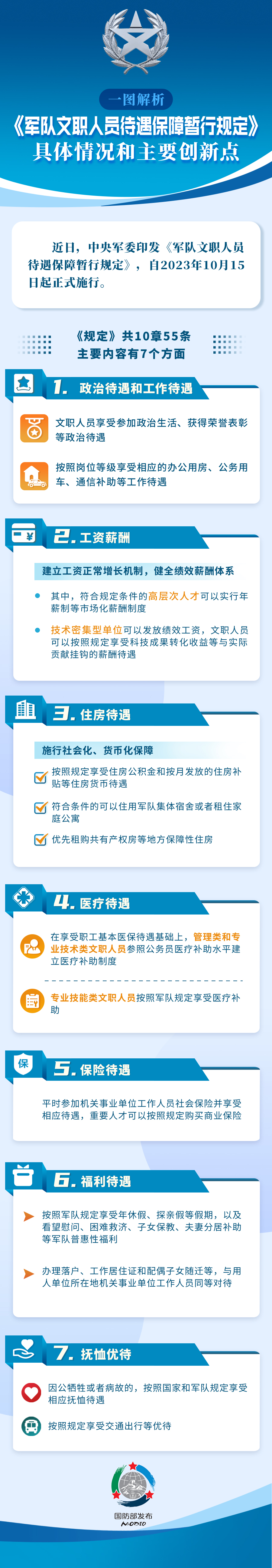 六是福利待遇。按照軍隊(duì)規(guī)定享受年休假、探親假等假期,以及看望慰問(wèn)、困難救濟(jì)、子女保教、夫妻分居補(bǔ)助等軍隊(duì)普惠性福利。辦理落戶、工作居住證和配偶子女隨遷等,與用人單位所在地機(jī)關(guān)事業(yè)單位工作人員同等對(duì)待。