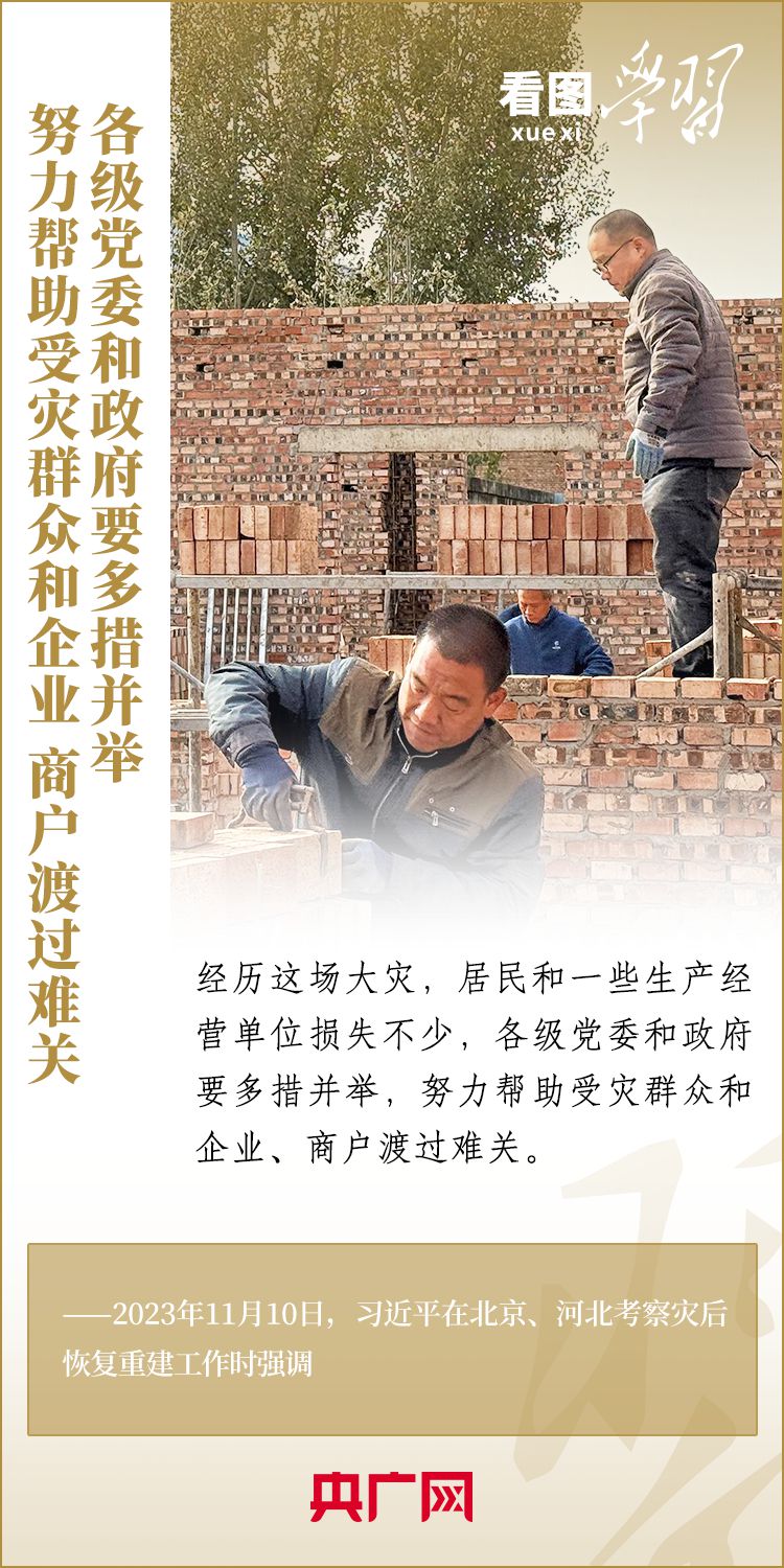 11月10日,習(xí)近平總書記在北京、河北考察災(zāi)后恢復(fù)重建工作??倳浬钊雽W(xué)校、社區(qū)、村莊、水利工程工地,實地察看村容村貌,了解基礎(chǔ)設(shè)施恢復(fù)建設(shè)提升等情況,要求有關(guān)部門堅持以人民為中心,堅持系統(tǒng)觀念,著眼長遠、科學(xué)規(guī)劃,把恢復(fù)重建與推動高質(zhì)量發(fā)展、推進韌性城市建設(shè)、推進鄉(xiāng)村振興、推進生態(tài)文明建設(shè)等緊密結(jié)合起來,有針對性地采取措施,再接再厲抓好災(zāi)后恢復(fù)重建,確保廣大人民群眾安居樂業(yè)、溫暖過冬。