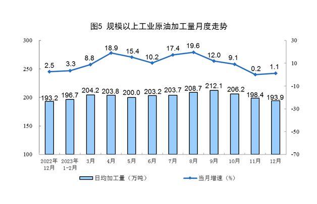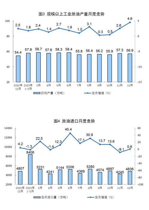 原油生產(chǎn)有所加快,進(jìn)口由降轉(zhuǎn)升。12月份,規(guī)上工業(yè)原油產(chǎn)量1765萬(wàn)噸,同比增長(zhǎng)4.6%,增速比11月份加快2.0個(gè)百分點(diǎn),日均產(chǎn)量56.9萬(wàn)噸。進(jìn)口原油4836萬(wàn)噸,同比增長(zhǎng)0.6%,11月份為下降9.1%。