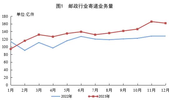 12月份,郵政行業(yè)寄遞業(yè)務(wù)量完成161.7億件,同比增長(zhǎng)26.5%。其中,快遞業(yè)務(wù)量完成132.6億件,同比增長(zhǎng)27.9%。