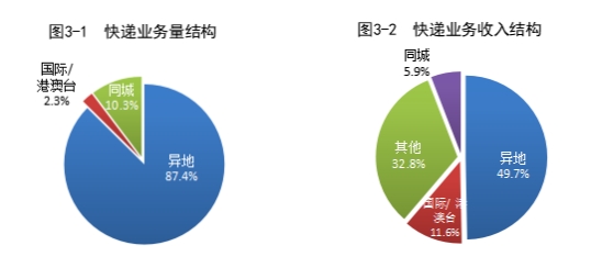 2023年,同城、異地、國(guó)際/港澳臺(tái)快遞業(yè)務(wù)量分別占全部快遞業(yè)務(wù)量的10.3%、87.4%和2.3%;業(yè)務(wù)收入分別占全部快遞收入的5.9%、49.7%和11.6%。與去年同期相比,同城快遞業(yè)務(wù)量的比重下降1.3個(gè)百分點(diǎn),異地快遞業(yè)務(wù)量的比重上升0.8個(gè)百分點(diǎn),國(guó)際/港澳臺(tái)業(yè)務(wù)量的比重上升0.5個(gè)百分點(diǎn)。