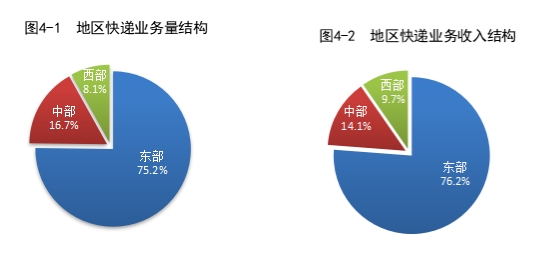 2023年,東、中、西部地區(qū)快遞業(yè)務(wù)量比重分別為75.2%、16.7%和8.1%,業(yè)務(wù)收入比重分別為76.2%、14.1%和9.7%。與去年同期相比,東部地區(qū)快遞業(yè)務(wù)量比重下降1.6個(gè)百分點(diǎn),快遞業(yè)務(wù)收入比重下降1.4個(gè)百分點(diǎn);中部地區(qū)快遞業(yè)務(wù)量比重上升1.0個(gè)百分點(diǎn),快遞業(yè)務(wù)收入比重上升0.7個(gè)百分點(diǎn);西部地區(qū)快遞業(yè)務(wù)量比重上升0.6個(gè)百分點(diǎn),快遞業(yè)務(wù)收入比重上升0.7個(gè)百分點(diǎn)。