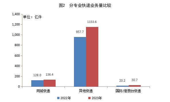 2023年,同城快遞業(yè)務(wù)量累計(jì)完成136.4億件,同比增長(zhǎng)6.6%;異地快遞業(yè)務(wù)量累計(jì)完成1153.6億件,同比增長(zhǎng)20.5%;國(guó)際/港澳臺(tái)快遞業(yè)務(wù)量累計(jì)完成30.7億件,同比增長(zhǎng)52.0%。