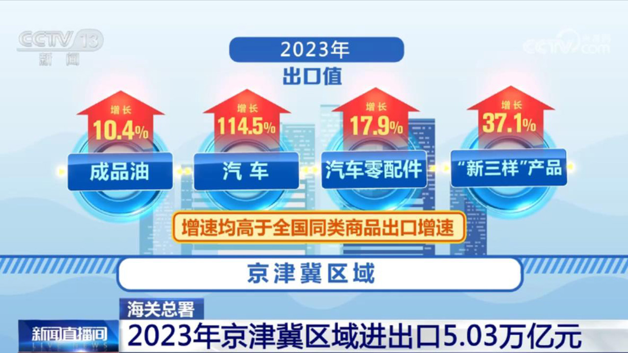 在出口方面,2023年京津冀區(qū)域出口1.31萬億元,增長2.5%,占全國出口總值的5.5%,其中,成品油、汽車、汽車零配件、“新三樣”產品的出口值分別增長10.4%、114.5%、17.9%、37.1%,增速均高于全國同類商品出口增速。