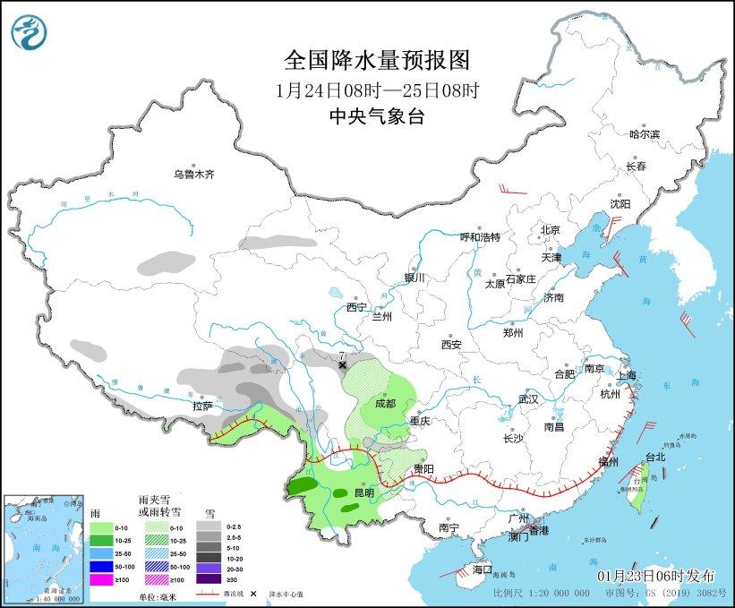 1月25日08時(shí)至26日08時(shí),西藏東部、青海南部、甘肅南部、川西高原北部、四川南部、貴州西部、云南東北部和西北部等地部分地區(qū)有小到中雪或雨夾雪。云南大部、貴州西南部等地部分地區(qū)有小到中雨(見(jiàn)圖5)。