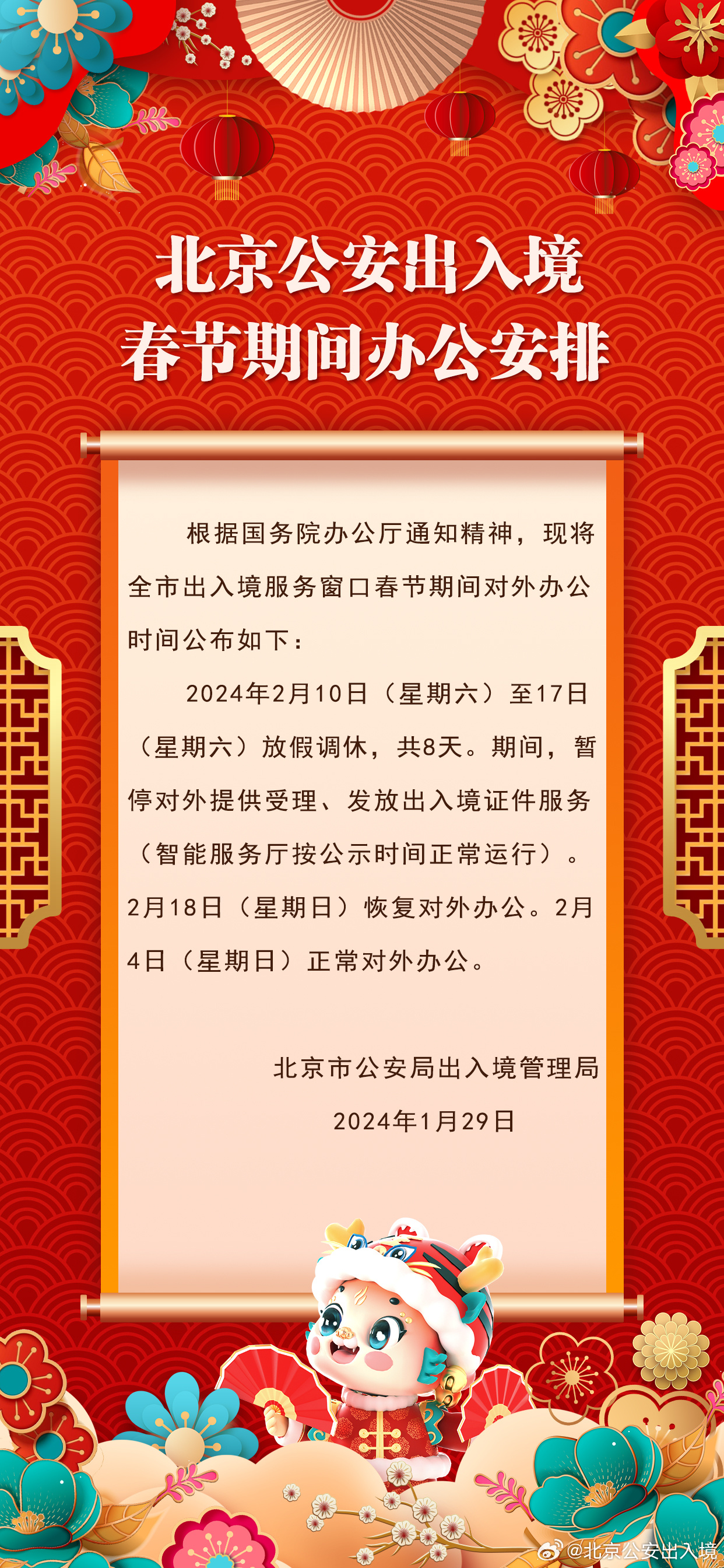 中新網(wǎng)1月29日電 據(jù)北京市公安局出入境管理局官方微博消息,北京市公安局出入境管理局發(fā)布春節(jié)期間辦公安排:北京市出入境服務窗口2月10日至17日(大年初一至初八)放假調(diào)休,共8天。期間,暫停對外提供受理、發(fā)放出入境證件服務(智能服務廳按公示時間正常運行)。2月18日(星期日)恢復對外辦公。2月4日(星期日)正常對外辦公。