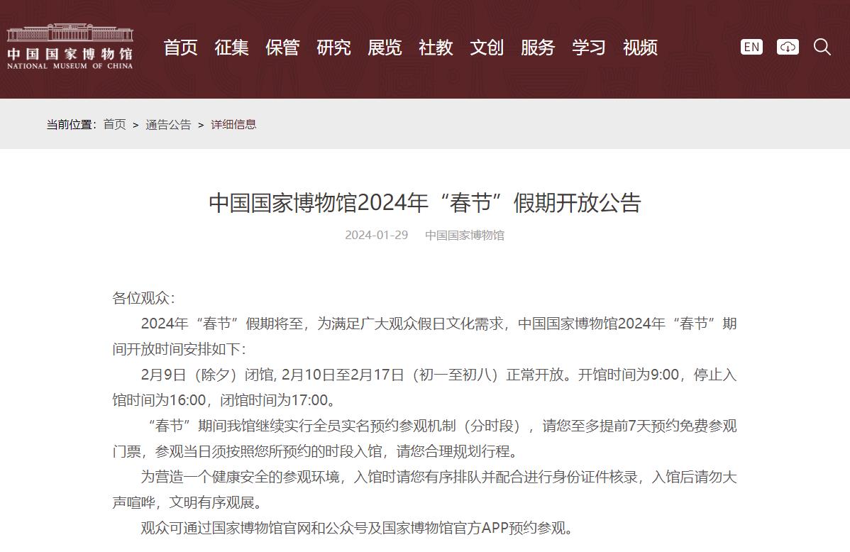 中國國家博物館:除夕閉館,初一至初八正常開放