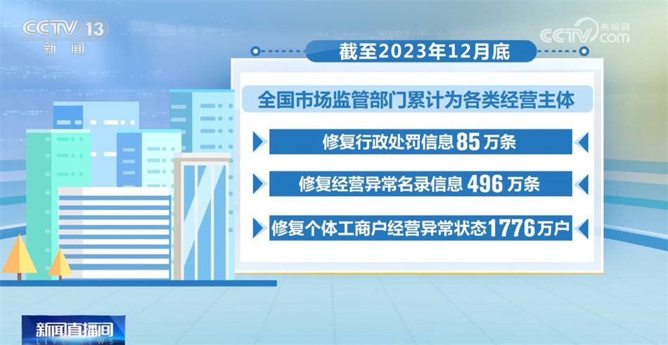 截至2023年12月底,全國(guó)市場(chǎng)監(jiān)管部門累計(jì)為各類經(jīng)營(yíng)主體修復(fù)行政處罰信息85萬條,修復(fù)經(jīng)營(yíng)異常名錄信息496萬條,修復(fù)個(gè)體工商戶經(jīng)營(yíng)異常狀態(tài)1776萬戶。