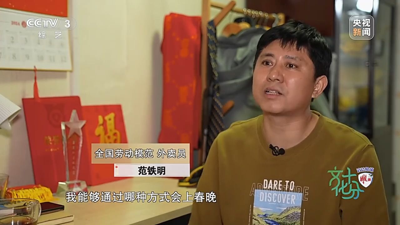 全國勞動模范 外賣員 范鐵明:2023年,我被評為全國最美外賣配送員,這個獎項,不單純是給我個人的,實際上是對新就業(yè)群體,對騎手的一個認可。根本就沒有想到我能夠通過哪種方式會上春晚,因為我又不是專業(yè)的演職人員,當時我并不是很相信,我們分配的是《勞動最光榮》,它是一個通過動畫片的形式,就是我們兒時都會看一些動畫片,動畫片里都會有一些主人公,比如說《黑貓警長》當中的黑貓警長,《大鬧天宮》里的孫悟空,包括《小貓釣魚》里頭的貓媽媽,當然都是我們當時崇拜的一個對象,最終我們成為或即將成為他們。