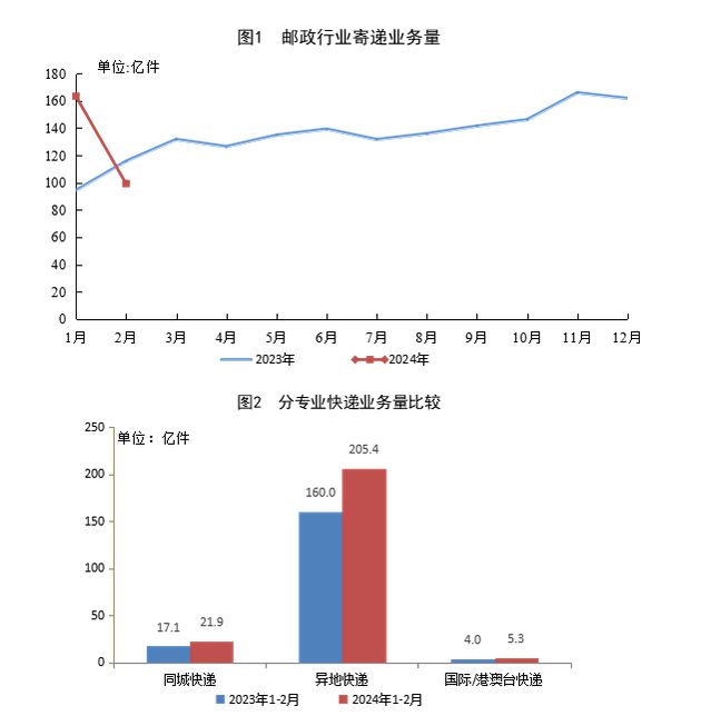 1-2月,同城快遞業(yè)務量完成21.9億件,同比增長28.3%;異地快遞業(yè)務量完成205.4億件,同比增長28.5%;國際/港澳臺快遞業(yè)務量完成5.3億件,同比增長31.9%。