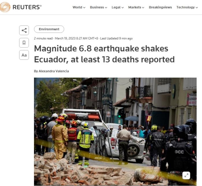 中新網(wǎng)3月19日 綜合外媒報(bào)道,當(dāng)?shù)貢r(shí)間18日約12時(shí),厄瓜多爾發(fā)生6.8級(jí)地震,造成至少14人遇難,超過(guò)380人受傷,多處房屋、學(xué)校和醫(yī)療中心遭到結(jié)構(gòu)性破壞。