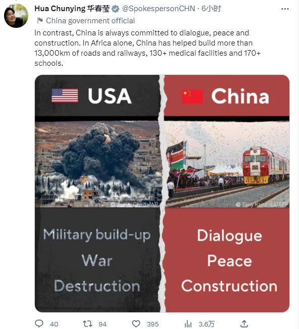 華春瑩接著在第二條推文中發(fā)了一張中美對(duì)比圖,圖中顯示美國(guó)沉迷于軍事建設(shè)、戰(zhàn)爭(zhēng)和破壞。“相比之下,中國(guó)始終堅(jiān)持對(duì)話、和平、建設(shè)。僅在非洲,中國(guó)就援建了1.3萬(wàn)多公里公路和鐵路、130多個(gè)醫(yī)療設(shè)施、170多所學(xué)校?!比A春瑩說(shuō)。