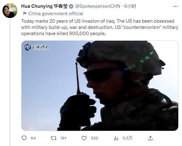 華春瑩在第一條推文中轉(zhuǎn)發(fā)了關(guān)于美國(guó)發(fā)動(dòng)伊拉克戰(zhàn)爭(zhēng)的一個(gè)調(diào)查視頻,并配文稱(chēng),“今天是美國(guó)入侵伊拉克20周年。美國(guó)一直沉迷于軍事建設(shè)、戰(zhàn)爭(zhēng)和破壞。美國(guó)的‘反恐’軍事行動(dòng)已造成90萬(wàn)人死亡?!?/p>