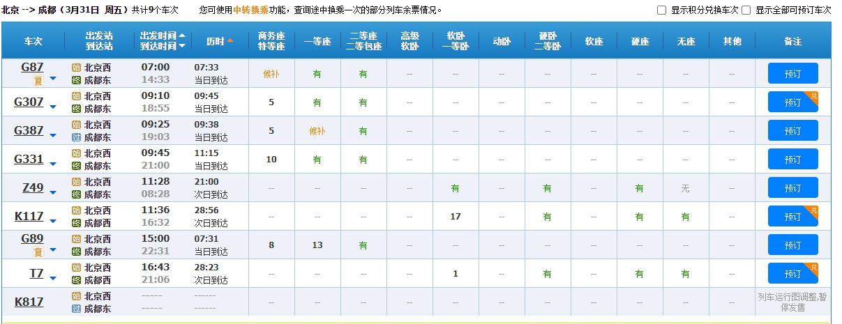 以北京開往上海、杭州、成都等方向的列車為例,3月31日、4月1日車次多數(shù)余票充足,僅個(gè)別車次需要候補(bǔ)購票。