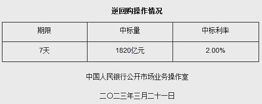 中新網(wǎng)3月21日電 據(jù)央行網(wǎng)站21日消息,為維護銀行體系流動性合理充裕,2023年3月21日人民銀行以利率招標方式開展了1820億元逆回購操作,期限為7天,中標利率為2.00%。(中新財經(jīng))