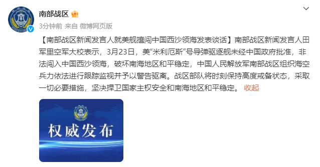 中新網(wǎng)3月23日電 據(jù)中國人民解放軍南部戰(zhàn)區(qū)官方微博消息,南部戰(zhàn)區(qū)新聞發(fā)言人田軍里空軍大校表示,3月23日,美“米利厄斯”號(hào)導(dǎo)彈驅(qū)逐艦未經(jīng)中國政府批準(zhǔn),非法闖入中國西沙領(lǐng)海,破壞南海地區(qū)和平穩(wěn)定,中國人民解放軍南部戰(zhàn)區(qū)組織海空兵力依法進(jìn)行跟蹤監(jiān)視并予以警告驅(qū)離。戰(zhàn)區(qū)部隊(duì)將時(shí)刻保持高度戒備狀態(tài),采取一切必要措施,堅(jiān)決捍衛(wèi)國家主權(quán)安全和南海地區(qū)和平穩(wěn)定。