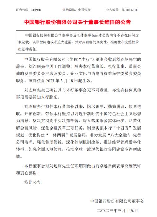 另外,19日,中國銀行公告稱,劉連舸因工作調(diào)整,辭去董事長、執(zhí)行董事、董事會戰(zhàn)略發(fā)展委員會主席及委員、企業(yè)文化與消費(fèi)者權(quán)益保護(hù)委員會委員職務(wù)。